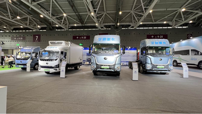 宇通展示的是当下最具代表性的新能源纯电重卡、轻卡产品,包括400度底置充电牵引车、400度后背充电牵引车、T5冷藏车、T5厢式底盘等,代表宇通在创新产品上的强大实力,是钢铁、冷链运输、城际运输等细分市场的好搭档。