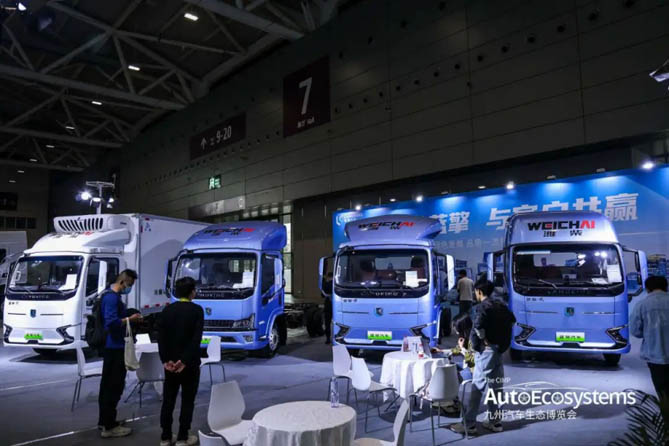 潍柴新能源商用车展示了潍柴蓝擎-EHPro 96度平台、135度平台、156度平台,以及潍柴蓝擎-EH 135度平台产品。其中,领先的156度平台产品,拥有520公里的超长续航,平地板,可选高顶卧铺,汇川集成桥电机165千瓦,是行业内较具代表性的大电量、高端轻卡产品。