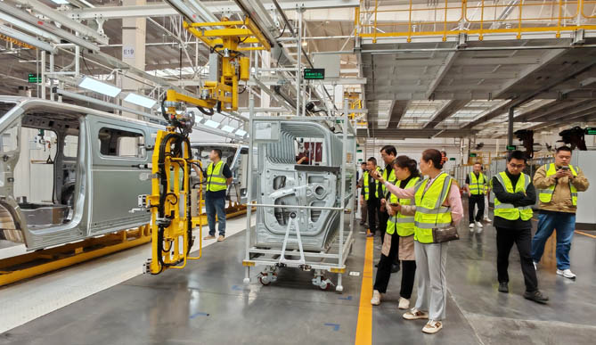生产线上,一辆辆图雅诺新品在经过40多道工序后,以崭新之姿下线。物流大咖们驻足在焊接、装配等环节参观,向工作人员询问生产情况、技术工艺、管理等问题。
