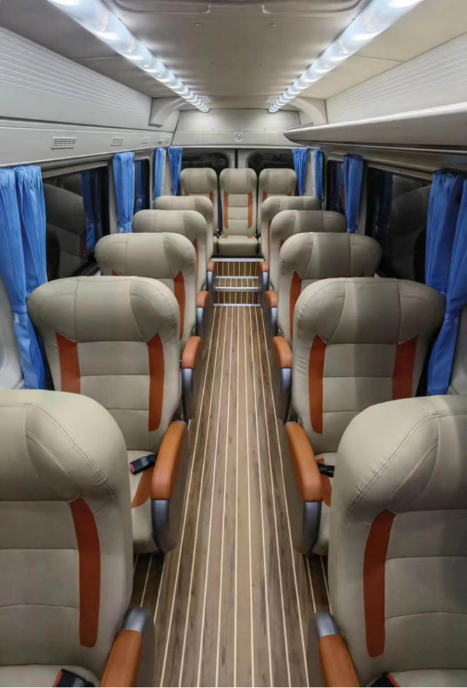 5.9米欧睿采用1+1座椅布置,有7-9座三种座位数选择;采用1+2座椅布置形式,最多可以布置16座。