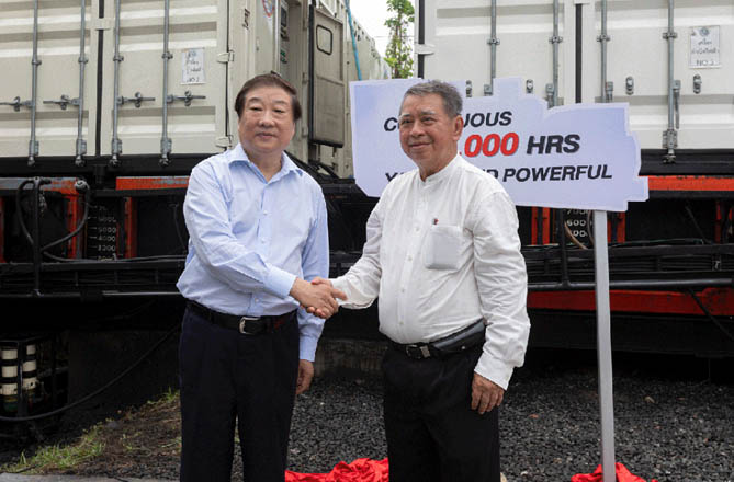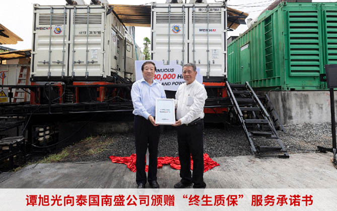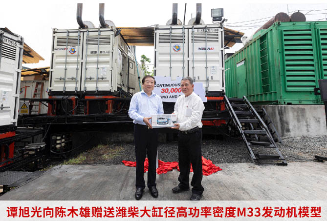 谭旭光与陈木雄共同为泰国锡江岛电站3兆瓦的潍柴12M33发电机组运行3万小时揭牌。