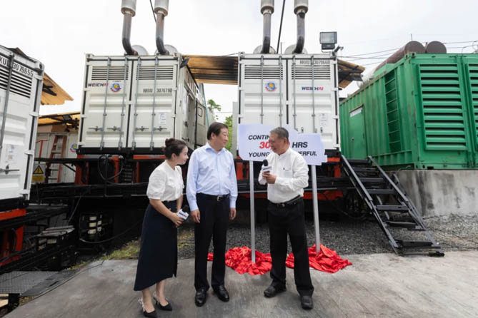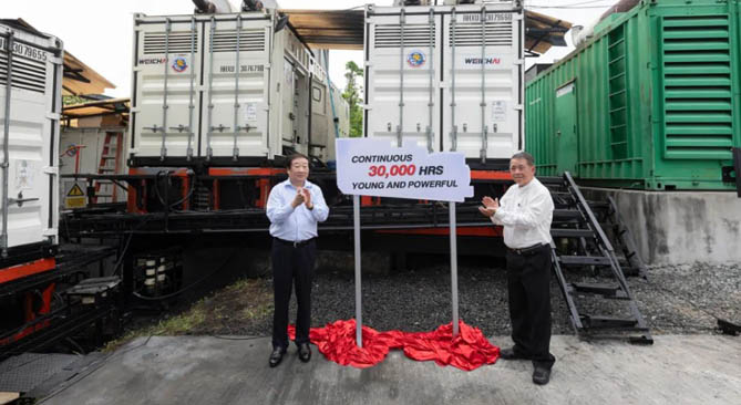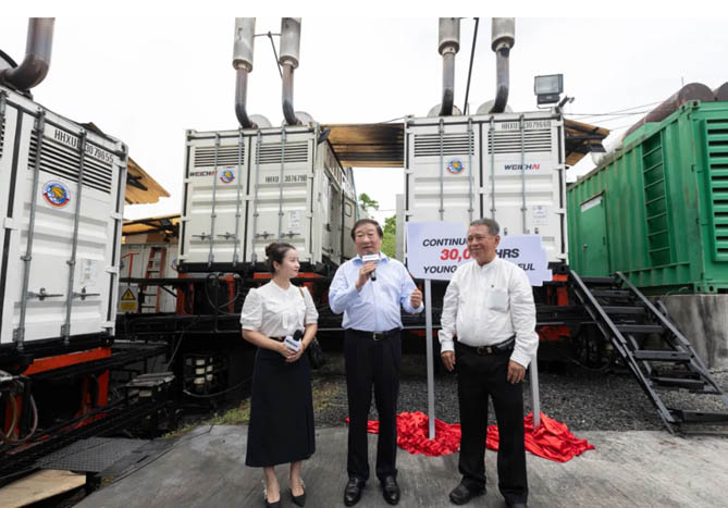 4月10日上午,泰国锡江岛电站潍柴发电机组运行3万小时活动仪式成功举行,谭旭光与泰国南盛公司董事长陈木雄共同见证这一里程碑式历史时刻。
