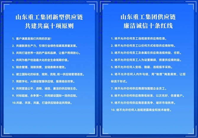 会议发布山东重工集团新型供应链共建共赢“十项原则”与供应链廉洁诚信“十条红线”。