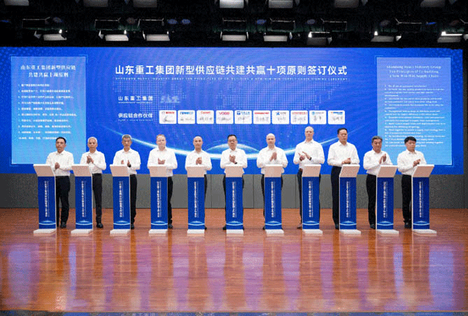 山东重工与国内外供应商代表分别签署新型供应链共建共赢“十项原则”承诺书与供应链廉洁诚信“十条红线”承诺书。