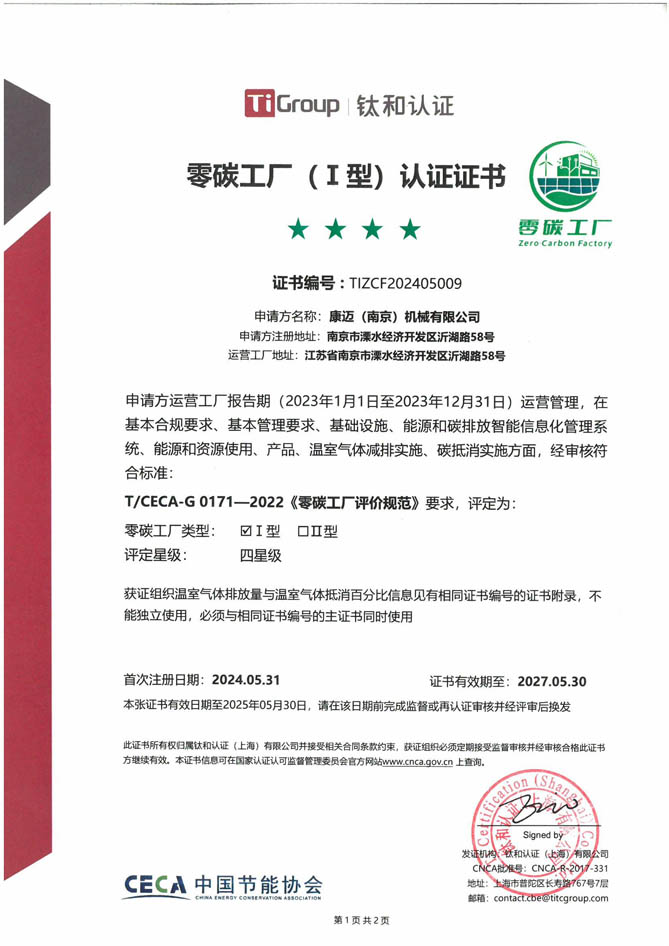 2024年10月,康迈南京工厂荣获四星级“零碳工厂”认证,这一认证标志着康迈在可持续发展领域迈出了重要一步,并展示了康迈在降低环境影响和推动中国制造基地创新方面的坚定承诺。