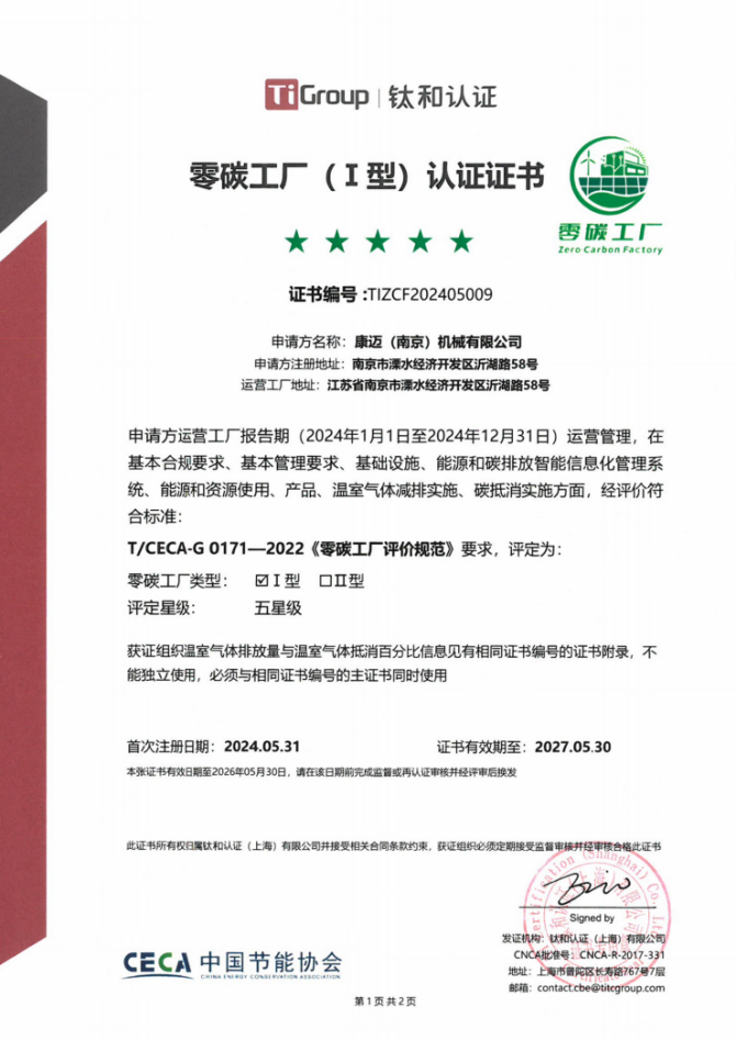 近日,康迈南京工厂成功获得五星级I型零碳工厂认证,迈出绿色新突破。这不仅是继2023年获得四星级认证后的进一步提升,更是康迈持续深化碳减排、绿色制造的阶段性成果,体现了康迈在绿色制造领域的持续优化与领先实践。