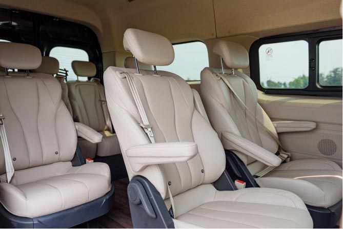 进入车内,内饰与空间氛围更是尽显尊贵。聚星客车可选5座至9座布局,入怀式豪华座椅包裹性好,坐感柔软舒适;且座椅采用纳米级透气面料,冬暖夏凉,加上亲肤皮质扶手,触感细腻,让人如同置身于家中一般轻松惬意;后排座椅配有独立头枕、独立式三点安全带与座椅靠背调节功能与儿童座椅卡扣,对于家庭出行来说不仅能够缓解旅途劳累,安全性也有所提升;聚星客车还拥有百宝箱般的收纳设计,放置书籍、瓶子、纸巾等日常用品不在话下。