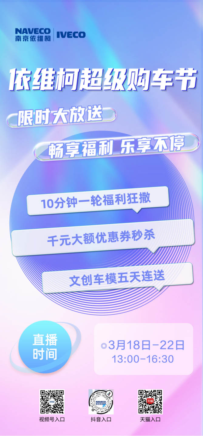 南京依维柯超级购车节即将震撼开启,希望每位消费者都能在这场购车盛宴中,邂逅属于自己的好车,享受舒适与愉悦的用车生活。3月18日至3月22日,南京依维柯抖音、视频号、天猫等平台超级购车节,等你来选购哦!