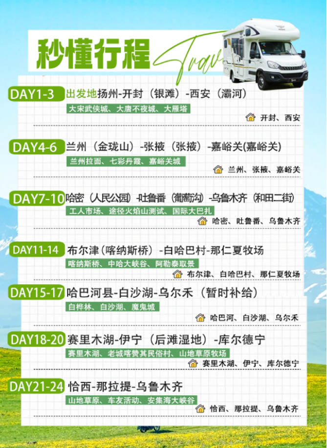 扬州→开封→西安→兰州→张掖→嘉峪关→哈密→吐鲁番→乌鲁木齐→布尔津→白哈巴村→那仁夏牧场→白沙湖→乌尔禾→赛里木湖→伊宁→库尔德宁→恰西→那拉提→乌鲁木齐返程