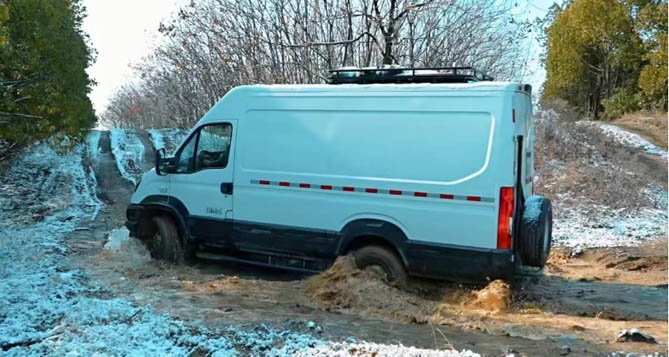 跋山涉海,如履平地,依维柯越野最给力!面对高原上崎岖的山路与湿滑的路面,依维柯4X4的全时四驱系统与三把电控差速锁成为了其制胜的法宝。当一侧轮胎遭遇打滑困境时,差速锁迅速响应,智能分配动力至另一侧轮胎,确保车辆始终保持最佳牵引力,在全地形轮胎的加持下,无论是陡峭的山坡还是泥泞的沼泽,依维柯4X4都能稳健前行,让越野驾驶成为一种享受而非挑战。