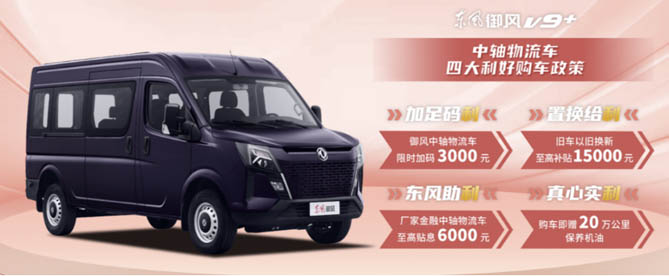 2024年9月1日至10月31日,购买东风御风V9+中轴物流车可享受3000元补贴及20万公里保养机油,以旧换新可享国补,至高可达15000元,厂家金融贴息至高6000元,好车好价,给“利”来袭,正是广大车友入手的绝佳时机。详情可咨询当地经销商,东风御风V9+ 为美好生活提速!