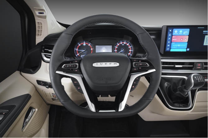 当您踏入依维柯聚星车内,首先映入眼帘的是一块12.3寸高清触控大屏,其搭载的第三代IVECONNECT智能交互系统集成了腾讯TAI智能车载系统,仿佛将一个智能娱乐中心呈现在您眼前。坐在车内,您无需再手忙脚乱地翻找手机,只需点击车载微信,即可轻松顺畅交流。智能导航凭借精准的定位和实时路况信息,能迅速为您规划最优路线,让您从容出行,尽享轻奢驾趣。PEPS系统实现了无钥匙进入和一键启动,为驾乘者塑造智能轻奢的出行场景,这与搜狐追求的品质出行理念高度契合。