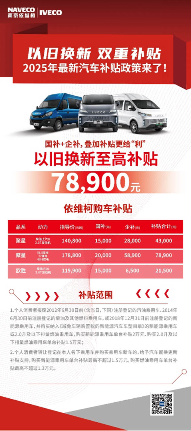 本次活动补贴范围包括,个人消费者报废2012年6月30日前(含当日,下同)注册登记的汽油乘用车、2014年6月30日前注册登记的柴油及其他燃料乘用车,或2018年12月31日前注册登记的新能源乘用车,并购买纳入《减免车辆购置税的新能源汽车车型目录》的新能源乘用车或2.0升及以下排量燃油乘用车,购买新能源乘用车单台补贴2万元、购买2.0升及以下排量燃油乘用车单台补贴1.5万元;个人消费者转让登记在本人名下乘用车并购买乘用车新车的,给予汽车置换更新补贴支持,购买新能源乘用车单台补贴最高不超过1.5万元,购买燃油乘用车单台补贴最高不超过1.3万元。以上这些都能享受到南京依维柯的这波补贴政策哦!快来瞅瞅你的车能不能搭上这趟顺风车吧!