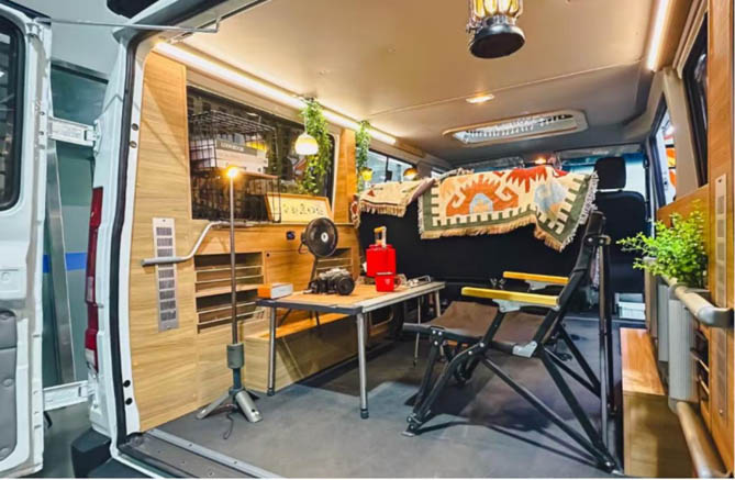 得意宿营车的非承载式车身以及超大内部空间,则为改装爱好者提供广阔的自由发挥空间。对于热衷于野钓的玩家而言,在车身外挂板加装鱼竿固定架,巧妙解决钓具收纳难题;偏爱骑行的露营者,在车顶行李架拓展自行车支架,抵达山区后便可尽情享受骑行的乐趣;聚会时,利用侧挂水箱和遮阳篷可以轻松搭建起一个临时的户外厨房;如果你享受独处的时光,还可DIY专属于你的创作空间。
