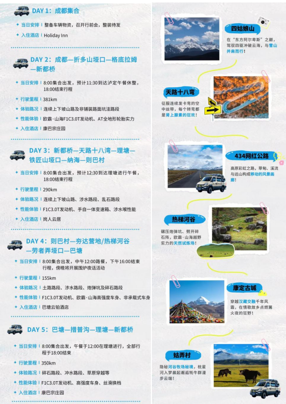 忘掉平坦的柏油路,这次的征途是对驾驶技术、车辆性能和个人意志的三重考验。欧霸·山海将和你一起穿越一系列传说中的地标,每一公里都充满了未知与激情。在翻越折多山垭口、铁匠山垭口时,你将在稀薄的空气中感受心脏与引擎的共鸣;在途经“摄影家天堂”新都桥、壮丽的格底拉姆、神秘的措普沟时,你的双眼将饱览天堂级的美景;在挑战天路十八弯的连续急弯、434网红路的悬崖峭壁,以及遍布全程的非铺装路面、炮弹坑、乱石路、涉水路段和草原穿越时,这将会是一场技术的炼狱。