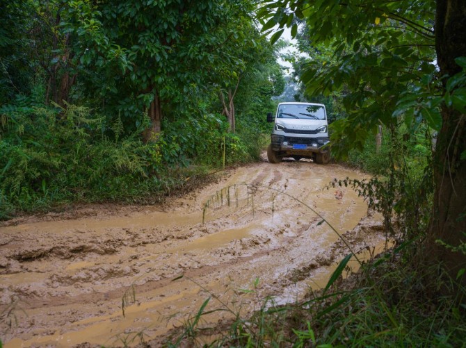 从鸡窝坑脱困而出,经过一段小树林,就来到第二个关卡——交叉轴路段。对拥有全时四驱+三把锁的依维柯欧霸·山海来说,想要通过这一关,其实并不困难,只需在低速四驱模式下锁止中央差速锁,万一遇到单侧后轮打滑的情况也没关系,只要启用后桥差速锁,让两个后轮同步转动,获得相同扭矩,‌一样可以轻松脱困。