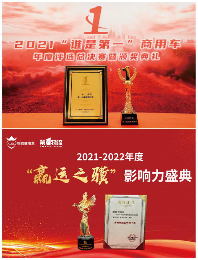 2021年11月25日,陕汽轻卡K5000在由第一商用车网主办的“谁是第一”商用车年度评选总决赛和第一物流网、韬克商用车主办的“赢运之骥”影响力活动盛典,分别获得“年度第一高端蓝牌轻卡”和“高端城配蓝牌轻卡”两项大奖,可谓双喜临门,再度奠定了陕汽轻卡K5000在高端蓝牌轻卡市场的领军地位。