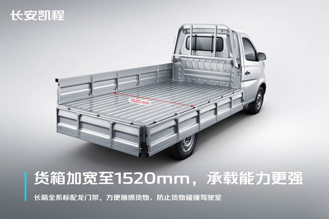 装得多,才能赢得多!新长安星卡以更宽的货箱和更强的承载能力,展现出非凡的实力!货箱宽度增加到了1520mm,轻松应对各种大件货物。长箱车型全系标配了龙门架,不仅便于货物捆绑,还能有效防止货物在运输过程中碰撞驾驶室,确保运输安全。多种尺寸选择,单排箱长3.06米/2.8米,双排箱长2.55米/2.26米,长短货箱组合,满足多元拉货需求。