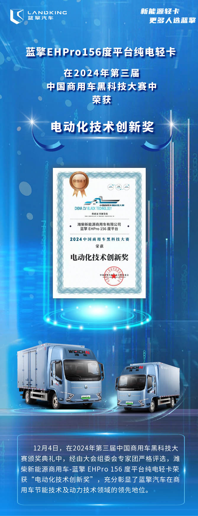 创新引领,科技赋能!蓝擎新能源轻卡荣获“电动化技术创新奖”!
