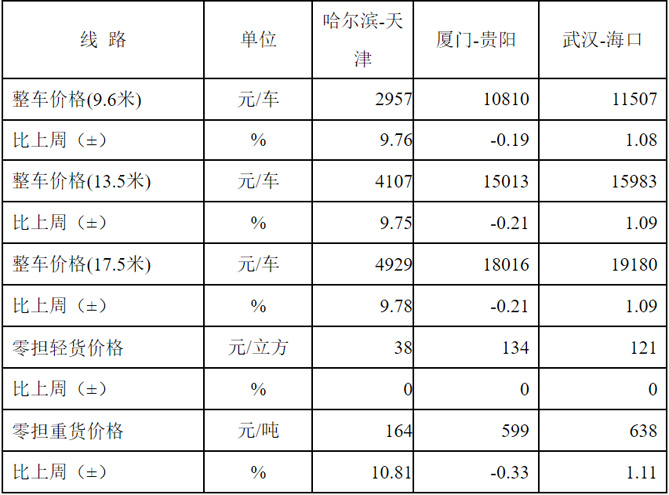 表1 本周部分线路平均价格及环比情况对比