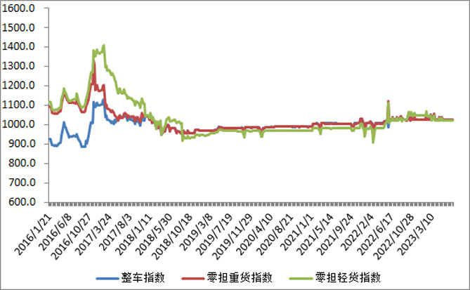 分车型看,各车型指数环比略微回升。其中,整车指数为1026.13点,比上周回升0.01%;零担轻货指数为1020.21点,比上周回升0.03%;零担重货指数为1025.21点,比上周回升0.02%。
