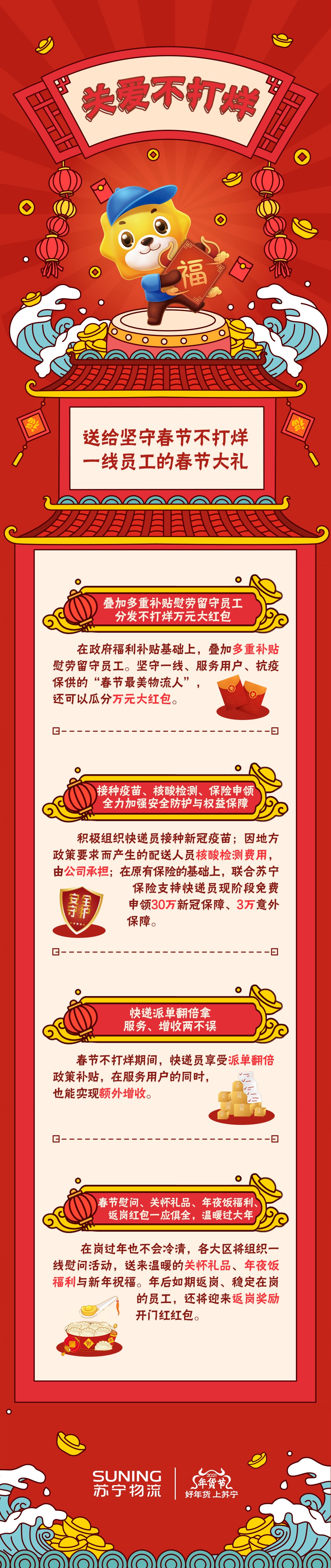 春节期间,苏宁物流加码对一线员工的关爱,推进“暖蜂行动”,通过福利补贴、派单翻倍、组织新冠疫苗接种、报销核酸检测费用等一系列举措,为一线物流员工送去节日关爱和温暖,让员工“留得下”,更能“过得好”。