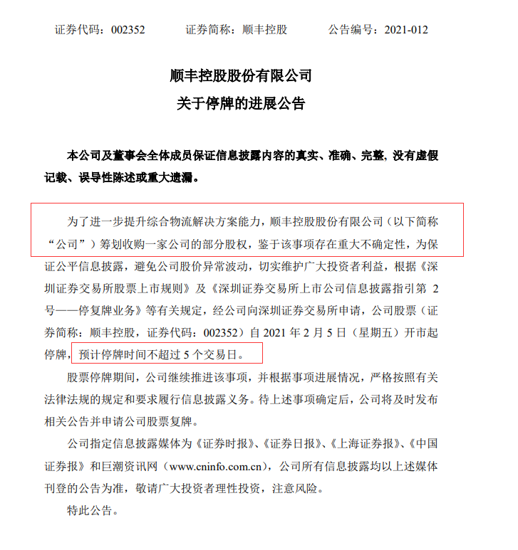 25日,顺丰控股公告,为了进一步提升综合物流解决方案能力,公司筹划收购一家公司的部分股权,预计停牌时间不超过5个交易日。同时,在港股市场上,嘉里建设、嘉里物流也于今天早间宣布停牌。