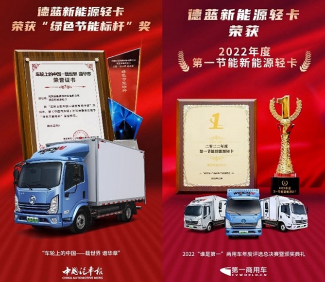 潍柴新能源商用车打造长续航智能电动轻卡,推行创新营销和暖心服务,帮助用户抵御行业寒流,降本增效、开源节流,提升运营收益。德蓝新能源轻卡采用潍柴自研电池,综合工况下续航里程可达300公里,快充仅需50分钟,消除续航焦虑,提升智能驾乘体验。德蓝新能源轻卡一举斩获“新锐创领”和“绿色节能标杆”双项大奖;展现出色的节能实力,荣获“2022年度第一节能新能源轻卡”大奖。