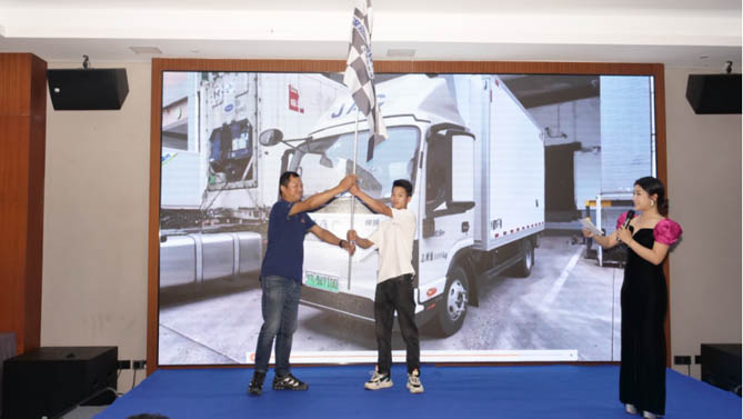 随后,与会领导共同上台,为新品上市启动揭幕。现场公布了购车政策,吸引了众多卡友的选择,多轮抽奖进一步带动了下订热情。江淮新能源轻卡专业人员介绍了新能源专属服务政策,直击城配物流痛点,为卡友保驾护航。下午,江淮新能源轻卡还携手卡车之家测评团队开启了“大湾区长续航挑战赛”,以实战验证跨城运输实力,用车轮丈量绿色物流的未来。