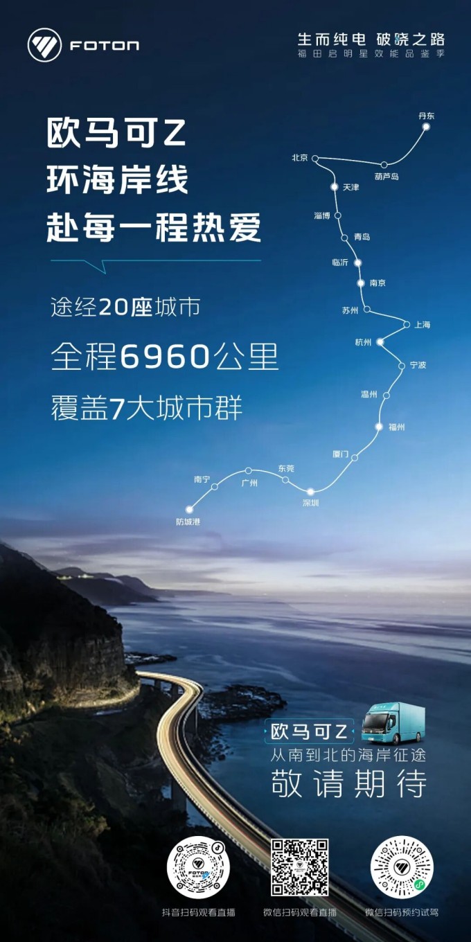 百闻不如一“鉴”,唯有实测见真章!自欧马可Z于12月上市以来,市场热度持续攀升,更有无数卡友致电询问,迫切期待亲身体验。为回应市场殷切期盼,福田汽车发起“生而纯电 破晓之路 ——福田启明星效能品鉴季”活动,邀请用户实景实测产品力。2026 年 1 月 23 日,首站防城港站即将正式启幕,届时,福田汽车携欧马可Z及旗下多品牌车型,以防城港为起点,开启一场贯穿中国海岸线、长达6960公里的效能远征。