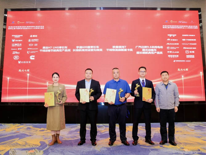 乘龙H7 LNG牵引车获得干线运输节能典范产品奖,宇通600度牵引车获得长续航高效运营先锋奖,欧曼银河7获得干线物流旗舰重卡奖,广汽日野9.6米纯电动厢式运输车获得超长续航典范产品奖;