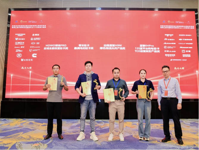 轻卡类,HOWO悍将PRO获得全域全能创富轻卡奖,零米轻卡获得最美电动轻卡奖,远程星智H9M获得绿色物流尖兵产品奖,蓝擎EHPro 135度平台纯电轻卡获得TCO运营典范产品奖;