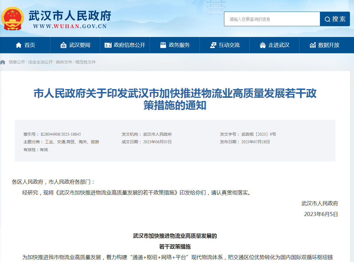 7月18日,武汉市人民政府印发《武汉市加快推进物流业高质量发展的若干政策措施》(简称《措施》),旨在加快推进武汉市物流业高质量发展,着力构建“通道+枢纽+网络+平台”现代物流体系,把交通区位优势转化为国内国际双循环枢纽链接优势。