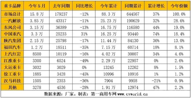 2021年前五个月重卡的销售数据统计出炉。