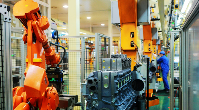 绿地面、棕过道,黑色的发动机缸体在工位间穿梭。工位上忙碌着的,有身着蓝工装的工人,更有白色、红色的机器人。2018年以来,这条生产线不断进行着智能化升级。