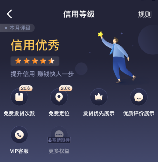 对于达到一定信用等级的货主,平台会给予荣誉认可及权益激励,信用优秀的货主将获得货源优先展示、专属客服、加赠发货次数等权益,反过来,针对信用等级低和有违约行为的货主,平台也将进行相应的处罚和功能限制。