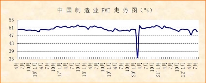 中国物流与采购联合会、国家统计局服务业调查中心发布的2022年7月份中国制造业采购经理指数(PMI)为49%,较上月下降1.2个百分点,在连续2个月环比上升后再次下降,且落入50%以下,表明经济运行受多地高温多雨短期季节性影响有所波动。分项指数变化显示,7月市场需求有所回落,企业生产经营活动放缓。但企业成本压力明显下降,就业保持相对稳定,新动能仍保持上升势头。当前需要重点关注市场需求不足问题,防范外部市场风险冲击。