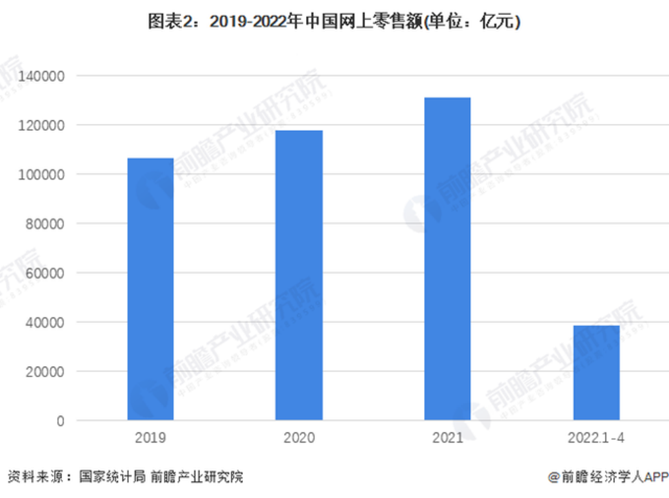 在中国,随着网上零售额持续增长,以及受到疫情居家影响,电商已经成为当今经济发展的一个重要领域。2021年线上销售增速超过10%,网上零售额突破12万亿元。2022年1至4月,网上零售额已经达到3.87万亿元,同比增长3.3%。