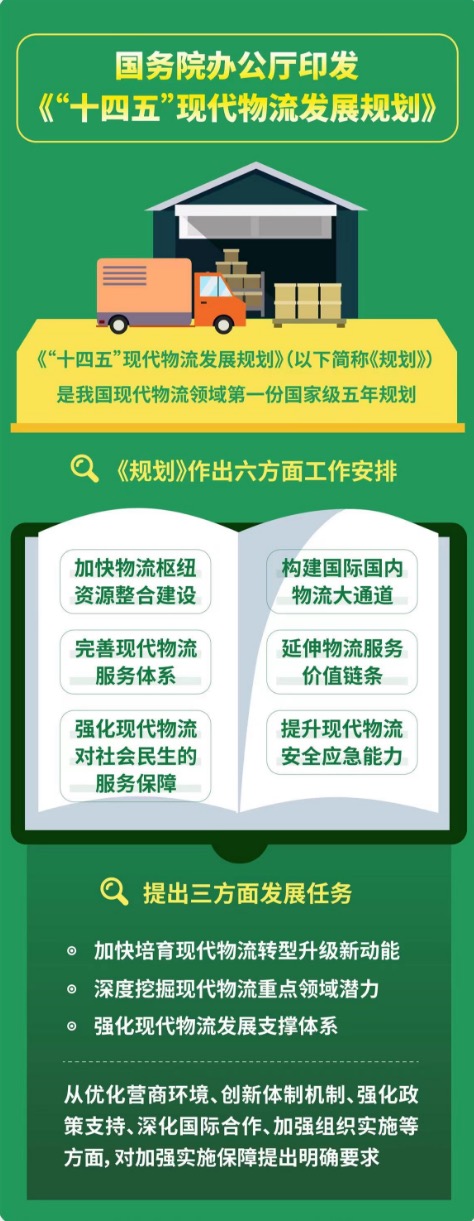 日前,国务院办公厅印发《“十四五”现代物流发展规划》(以下简称“《规划》”)。作为我国现代物流领域第一份国家级五年规划,《规划》指出,“十三五”以来,我国现代物流发展取得积极成效的同时,还面临着物流降本增效、结构性失衡、大而不强以及部分领域物流存在短板等突出问题。为此,《规划》从加快培育现代物流转型升级新动能、深度挖掘现代物流重点领域潜力、强化现代物流发展支撑体系等方面提出多项发展任务,并聚焦现代物流重点方向提出多项政策措施,明确到2025年,我国将基本建成供需适配、内外联通、安全高效、智慧绿色的现代物流体系。“现代物流发展对物流降本增效、打通区域市场、促进规则统一、加快运贸一体化以及区域一体化进程等都有着重要意义,关系着我国新发展格局构建以及高质量发展。”重庆工商大学长江上游经济研究中心研究员李然向《中国经营报》记者表示,现代物流能提高资源配置效率,促进国内统一大市场建设,同时对新发展格局构建也起着重要推动作用。