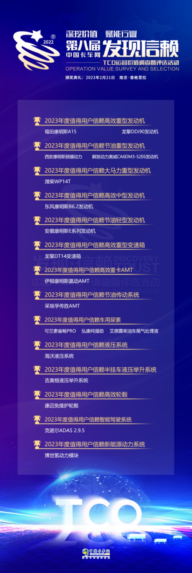 一个个值得信赖产品的评出,也点亮了2023年的卡车市场。在第八届发现信赖的颁奖典礼中,我们看到了卡车、零部件制造企业对产品的努力革新,也感受到了值得用户信赖产品为卡车企业、为物流运输行业带来的影响力。相信,有了这些信赖力量的注入,2023年卡车市场将会得到更大的鼓舞,得到更快的回暖,物流运输企业也将获得更多的运营价值。
