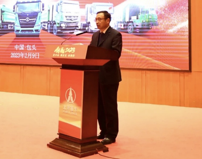 白国生在讲话中表示,北奔重汽召开的经销商年会,既是一场久别重逢的盛会,更是贯彻自治区党委、政府和包头市党委、政府关于属地重卡产业发展的落实会。自治区党委书记孙绍骋到任后,做出了“支持本地新能源重卡生产和推广使用”的重要指示;王莉霞主席在今年政府报告中提出了“加快推进制造业高端化、智能化、绿色化,实现‘风光氢储车’一体化推进”的具体要求。北奔重汽是自治区重要的本土军民融合型重卡企业,唯一具备资质的重卡制造企业,自成立以来助力地方经济社会发展,成为地方政府在改革发展中的中坚力量,在带动“呼包鄂乌”城市群周边大宗货物运输上,具有得天独厚的优势,是包头市打造千亿级新能源重卡产业集群的重要支撑。2023年,我们将坚定支持北奔重汽充分发挥产业链龙头作用,全力打造千亿级新能源重卡产业集群,支持北奔创新体制机制和营销模式。一是与北奔一起找客户、跑市场、找订单,主动对接属地大型企业和承运商,加快释放现有产能。进一步提高自治区市场占有率,引领自治区新能源重卡市场。二是加快充换电站建设进度,积极打造绿色物流枢纽,为新能源重卡销售提供好基础保障。三是发挥北奔新能源汽车产业链龙头带动作用,引进核心零部件落地包头,拉动上下游产业链聚集,建成西部地区汽车制造和零部件生产配套基地。同时希望北奔重汽在新的一年抢抓机遇、创新模式、奋勇争先,以“只争朝夕、大干快上”的紧迫感、责任感,满腔热情“爱包头”、立足产业“作贡献”,充分发挥新能源重卡产业链链长优势,全力推动自治区新能源重卡推广方案落地,打造成自治区千亿级新能源重卡产业集群,实现企地共赢。