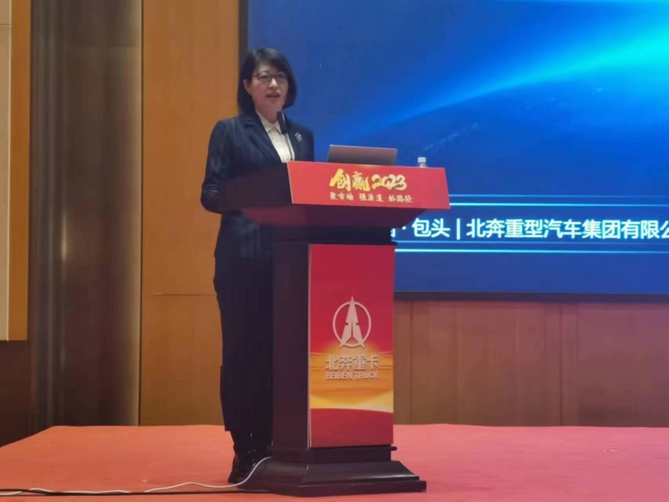 吕利萍作《共识北奔品牌 共建价值体系》讲解,指出,北奔重汽始终坚持传承人民兵工的红色基因,秉承奔驰技术的蓝色血液,承载绿色发展的核心使命。北奔重汽出生伟大,使命光荣,先后四次参加阅兵,七次参与神州系列飞船搜索任务,彰显实力担当。四次作为国家代表,参加国际军事比武项目,斩获多项荣誉。北奔重汽作为国内从生产线到工艺、到技术图纸全套德国基因的研产销一体化发展的重卡制造企业,连续30余年创工信部、交通部通报的零死亡企业。车架主副梁以奔驰技术独有的鱼腹型变截面不等宽一次冲压成型复合梁,被客户称为“压不断的脊梁”,北奔重卡凭借极高的承载性能,能够适应各种恶劣路况,创造了高出勤高收益的“奔驰技术中国造”的品牌之星。近年来积极践行国家双碳战略,坚持“政府培育、政策支撑,市场主导、技术支撑,场景先行、生态链协同,低碳绿色、包您满意”方针,打造“绿色物流运输方案解决提供商”。作为行业首家集成新能源重卡生态链、产业链、供应链、金融链企业,成为地方推动国家双碳战略的绿色发展主角、绿色运输主力、绿色产业链长。2023年,我们希望与各方合作伙伴携手共进,相互扶持,创赢未来。