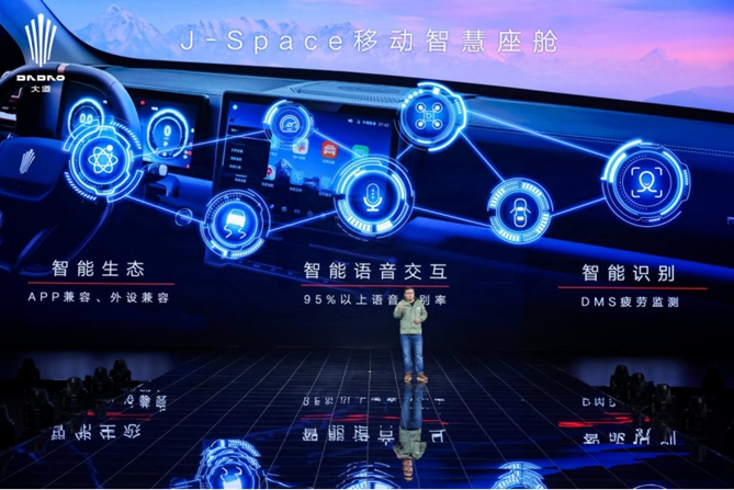 目前巡天架构下J-Space移动智慧座舱已经配备准确率高达95%以上的智能语音交互系统,具备车载KTV、家人语音、无人机伴飞等丰富功能。J-Link智能网联系统,通过预见性服务、智慧客服、线上专家,为用户提供全天24小时贴心管家式服务,同时在车机、车身、底盘、动力四大系统上,实现28款软件远程升级功能,预计在未来还将实现全车全域软件OTA。
