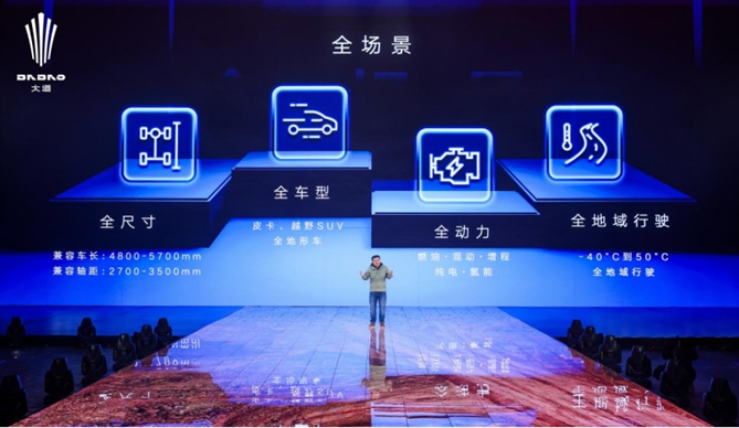 “巡天架构”覆盖全尺寸、全车型、全动力、全地域的车型开发需求。在巡天架构下,可以兼容2700-3500mm的轴距、4800-5700mm的车长,覆盖包括燃油、混动、增程、纯电、氢能等不同动力,可生产皮卡、越野SUV和全地形车不同车型,甚至还能够适应-40°C到50°C的不同环境,经得起不同地域的极限挑战。