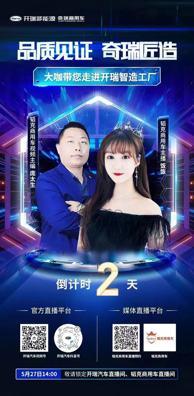 5月27日14点,以“品质见证 奇瑞匠造”为主题的走进开瑞智造工厂活动将正式开启!关注韬克商用车直播间,大咖带您走进奇瑞商用智造工厂,一同探秘开瑞汽车的高品质是怎样炼成的。