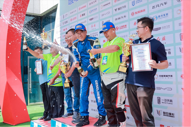 本次大赛精彩激烈,留下许多令人难忘的瞬间。其中,令广大观众印象最为深刻的画面是上汽红岩赛车手钮向阳热情喷洒着胜利的香槟,他驾驶的红岩杰狮H6氢能重卡以绝对优势率先驶过龙门,在竞争如此激烈的赛道之上,与第二名车辆拉开了近一分钟的距离。