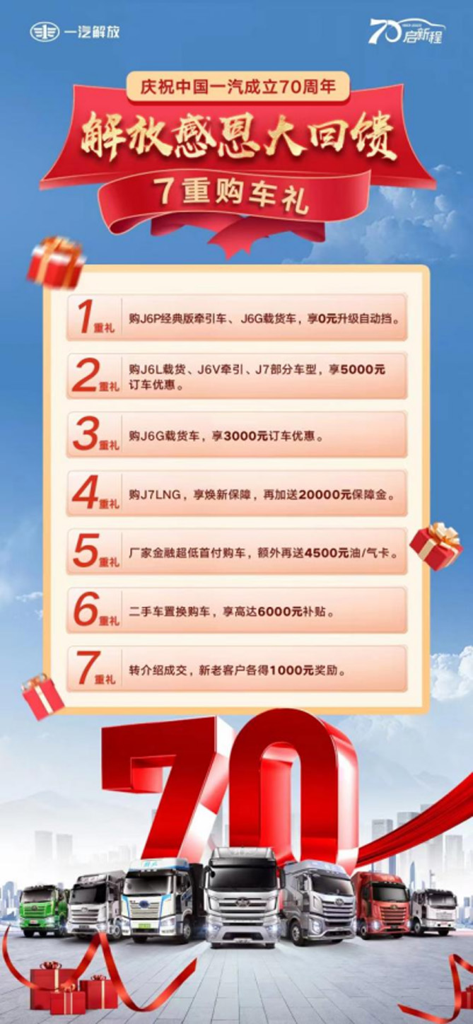 为献礼中国一汽70周年华诞,感恩用户厚爱,一汽解放近期特别推出包括超低首付购车、二手车置换优惠等在内的“七重礼”回馈广大卡友;同时,解放品牌共计70辆“特惠车”即将在线上抢购;近期到店用户,还将有机会享70周年“进店礼”……诸多精彩内容就在当下,不容错过!