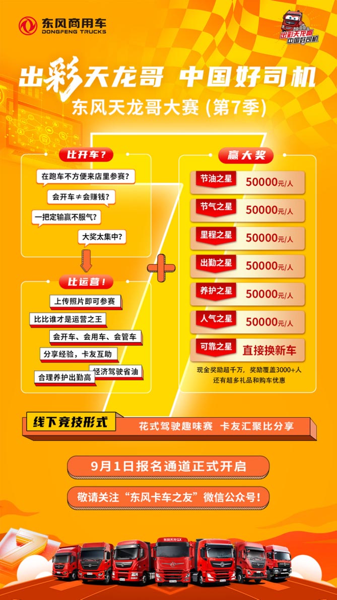 9月1日,点击微信公众号“东风卡车之友”或“东风车管家APP”的“出彩天龙哥”活动链接,均可报名!闪耀东风,由你出彩。大赛将开,敬请期待!