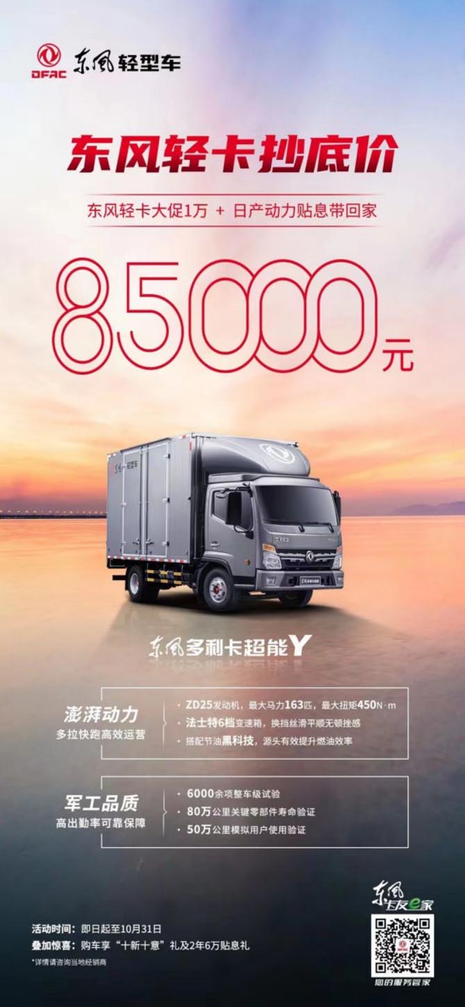 即日起至10月31日,购东风多利卡超能Y立省1万+,85000元起轻松带回家!价格优惠,品质不变,咱也是妥妥的“全能王”。