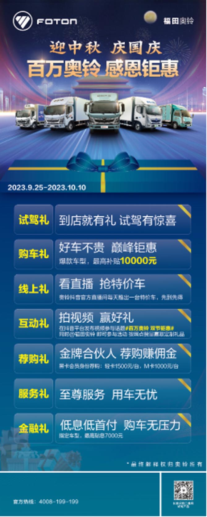 中秋团圆佳节,又逢祖国74岁华诞!值此双节盛事,为回馈百万卡友的大力支持,福田奥铃再次放出七重壕礼!9月25日-10月10日期间,无论是线下试驾,还是观看官方直播,或者创作内容,均有机会获得福田奥铃送出的精美礼品!购买奥铃混动、燃油全新产品还可享最高10000元补贴,以及金融售后服务等多重福利!一起来看看都有哪些超级优惠!